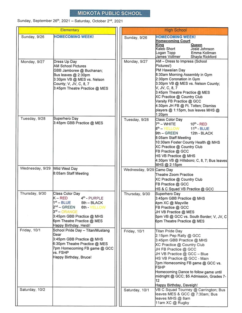 A look at this week! Please note that there IS NOT a C squad boys game today against Valley City, ONLY 8th & 7th. Those games will be played at GCC starting at 4:30pm in the blue gym. The GBB team will also be playing at GCC today against Oakes starting at 4:30pm with the girls C squad team in the main gym. If you have any questions, please feel free to call the HS at 785-2126. Have a great week!